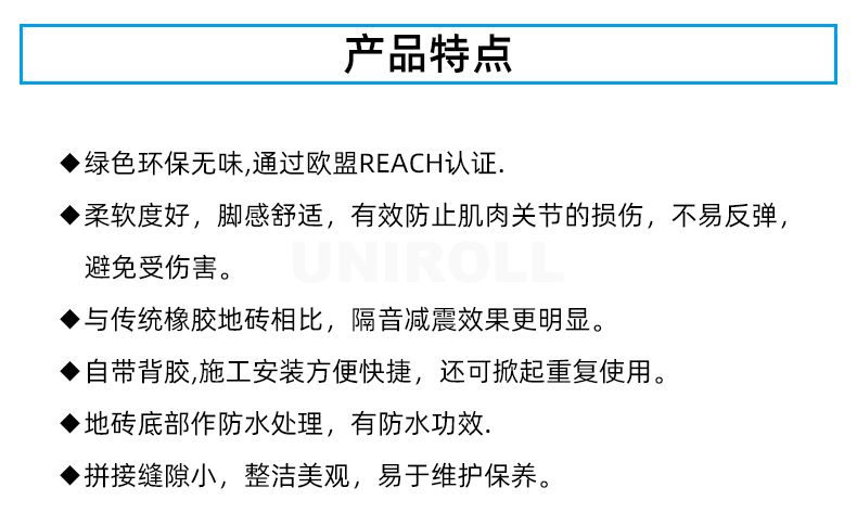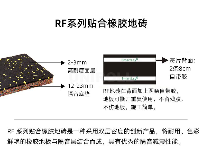 RF系列橡胶贴合地砖是一种创新产品,将耐用、色彩鲜艳的橡胶地板与隔音层结合而成,具有优秀的吸音减震性能。