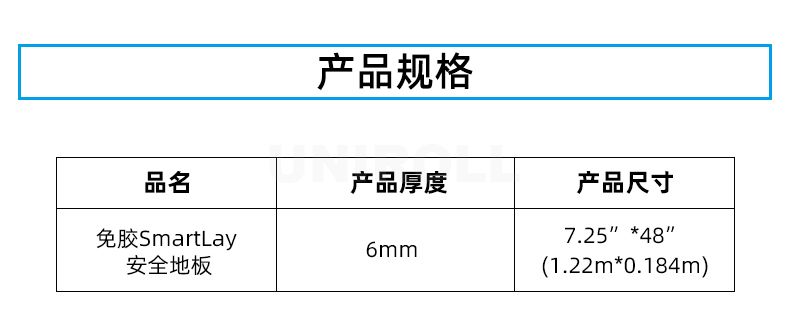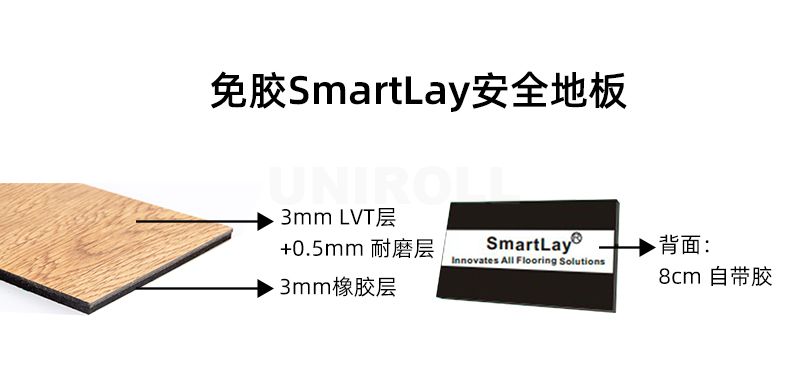 免胶SmartLay安全地板(RPC地板)是一款由高耐磨LVT和高弹性橡胶垫复合,自带背胶和防水、隔音系统的安全地板